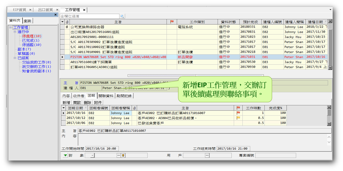 ERP系統結合交會辦工作管理,相關人員可即時回報工作進度。