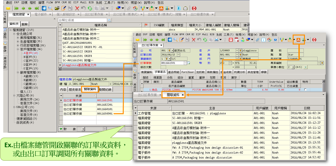 將客戶或供應商的交易相關文件歸檔在EIP系統之檔案總管,日後可隨時調閱和連結。